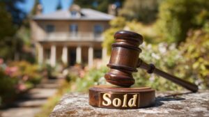 Wooden gavel resting on sound block with gold sold sign in front of blurred background featuring large house, suggesting real estate auction and successful sale